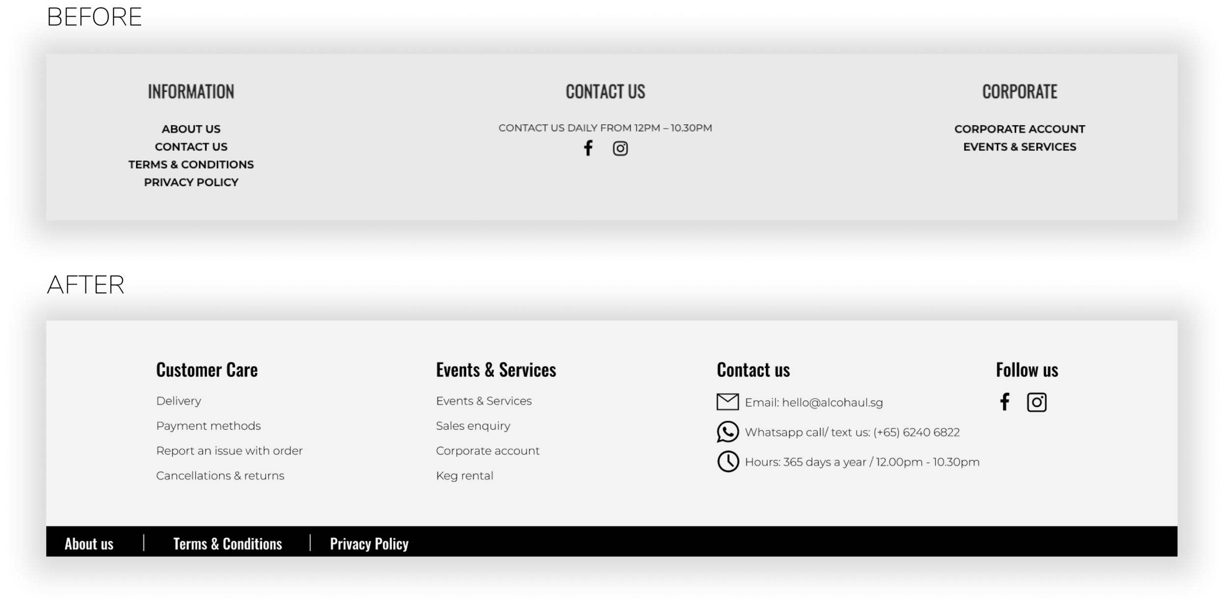 To further reduce the time and effort required to reach out to a customer service representation, I added a quick interaction for users to be immediately directed to Alcohaul’s Whatsapp page upon clicking on the number.