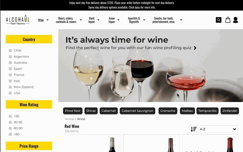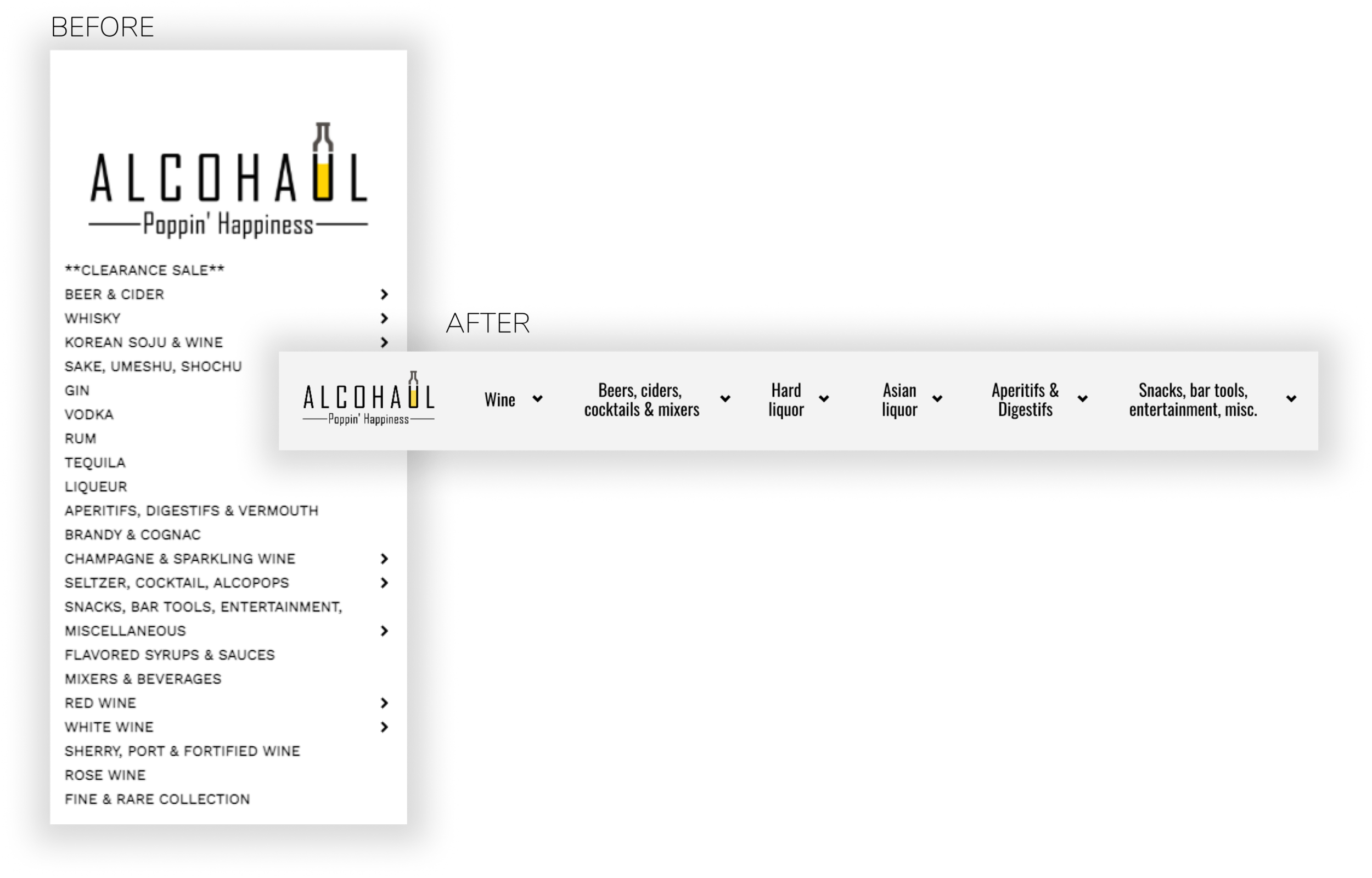 I identified 5 major groups of alcohol categories, which allowed me to streamline the overwhelming 20 categories shown on the mainpage down to a scannable 5, reducing homepage clutter.