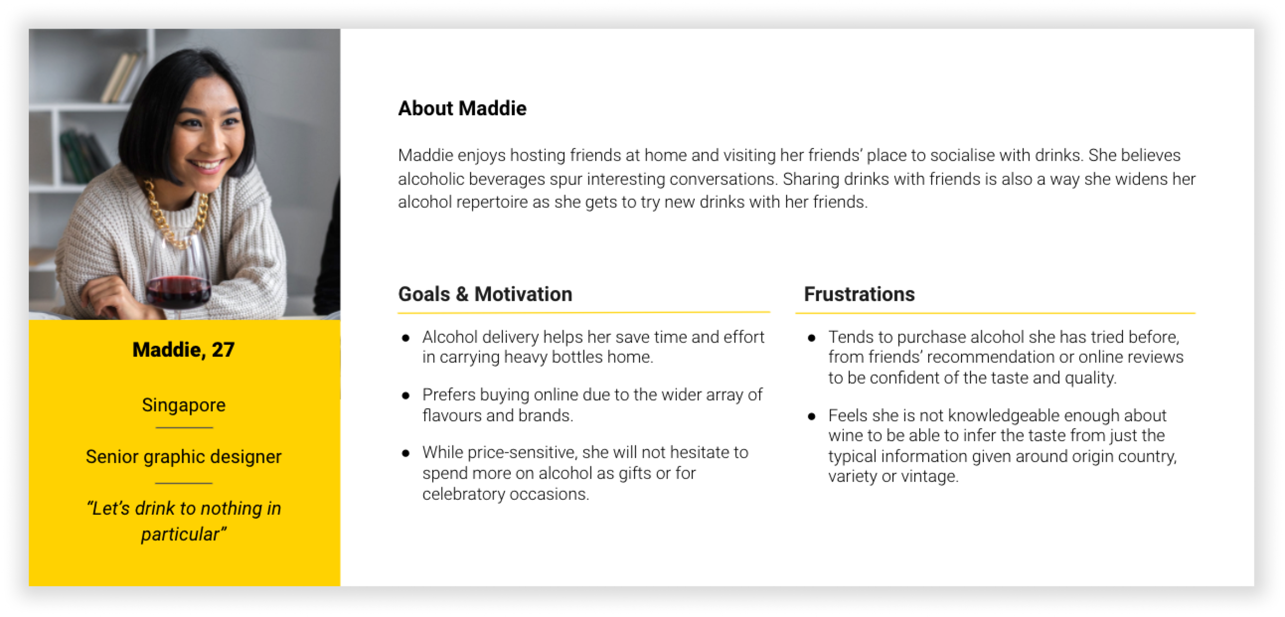 The insights from user interviews were distilled into my persona - Maddie, who is representative of the target user. She enjoys buying alcohol online due to the convenience and wide variety but is not confident in selecting a good product. Having a persona will allow me to keep in mind her unique background, goals and frustrations throughout the design process.